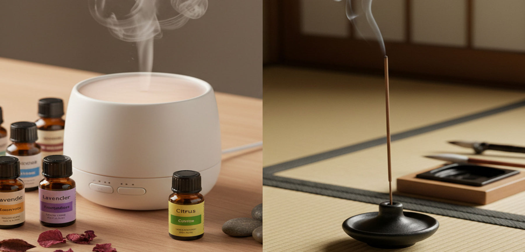 Aroma oils are extracted from plants, while incense is primarily made from aromatic woods. Aroma oils can be enjoyed immediately using a diffuser or an aroma pot. They come in a wide variety of scents and are ideal for those who do not prefer smoke.