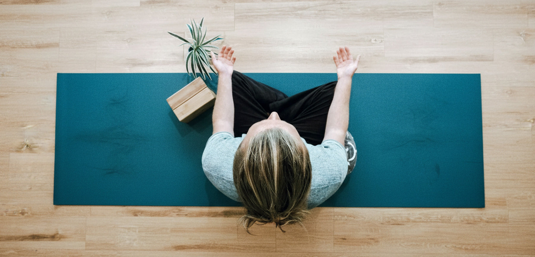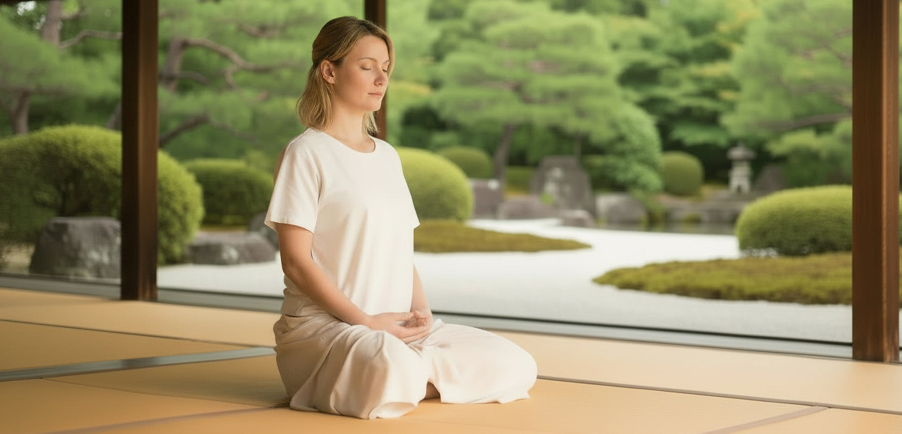 First, choose your sitting posture. Sit cross-legged, resting on your sit bones, and lengthen your spine. It’s important that you feel both comfortable and stable. Using a zabuton (floor cushion), yoga block, or small cushion can be very effective, especially if you experience discomfort from your sit bones pressing against the floor. Elevating your hips slightly helps straighten the spine and makes crossing your legs easier, allowing for a more relaxed cross-legged position.