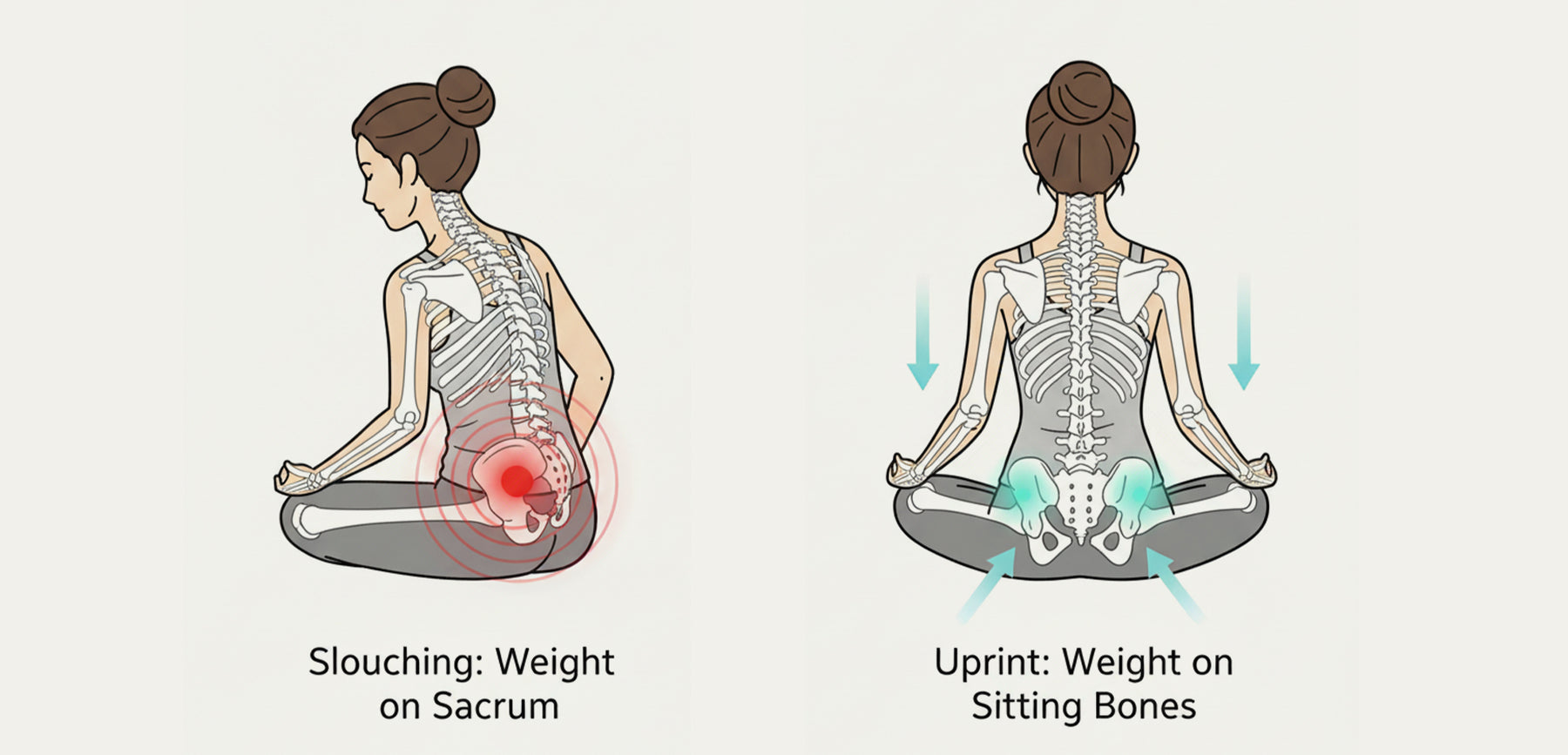 The sacrum sits low in the spine, just above the small tailbone at the very bottom—known as the coccyx. When we sit with a slouched posture—collapsing the belly and tilting the pelvis backward—we end up sitting directly on the sacrum. In this position, a single, small bone bears the weight of the entire upper body.